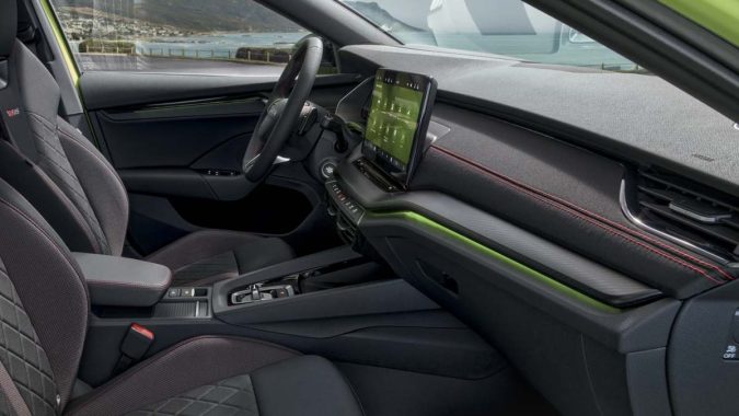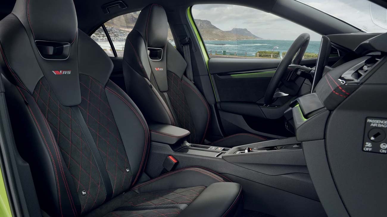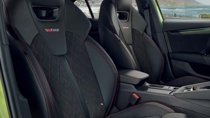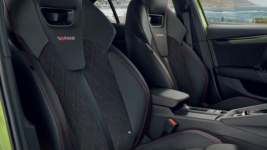 Octavia RS mang đến hai phong cách nội thất: RS Fabric và RS Suedia. Sự khác biệt chính nằm ở chất liệu trang trí và thiết kế ghế. RS Fabric được trang bị ghế thể thao bọc vải, trong khi RS Suedia mang lại trải nghiệm cao cấp hơn với ghế thể thao trước bọc Suedia có thiết kế công thái học.Ghế có khả năng chỉnh điện, hỗ trợ lưng chỉnh điện tích hợp chức năng massage và ghi nhớ vị trí, đồng thời cho phép điều chỉnh độ dài đệm ghế nhằm tối ưu sự thoải mái cho người ngồi.