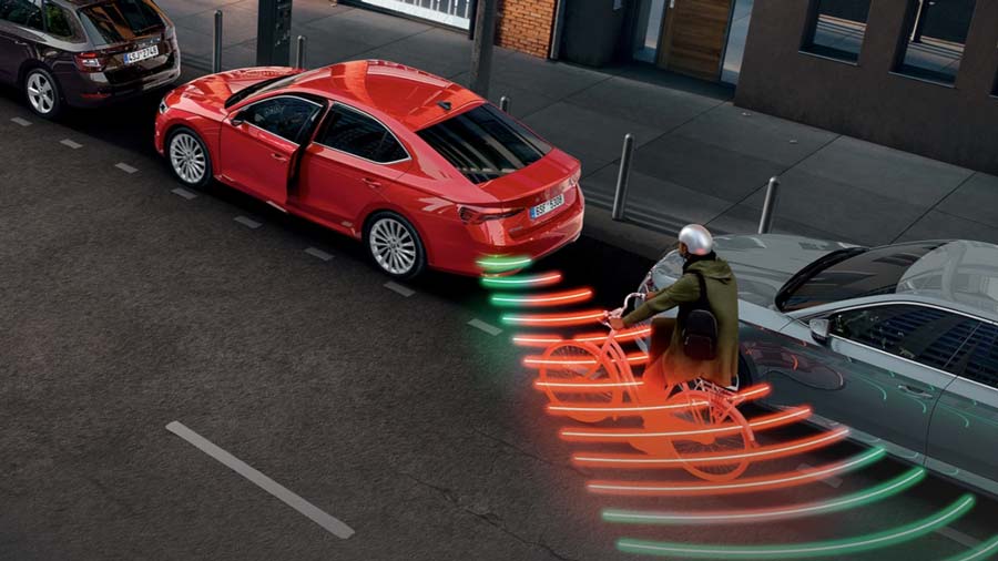 Exit Warning (Cảnh báo mở cửa): Exit Warning là một tính năng bổ trợ của Side Assist, giúp cảnh báo người lái và hành khách khi mở cửa xe có thể gây va chạm với phương tiện hoặc người tham gia giao thông khác – ví dụ như ô tô, xe đạp, xe điện hoặc người chạy bộ khi đỗ xe song song trên đường. Hệ thống sử dụng các cảm biến radar phía sau của Side Assist để giám sát khu vực phía sau và hai bên hông xe trong phạm vi lên đến 35 m, đảm bảo thao tác mở cửa được an toàn hơn.