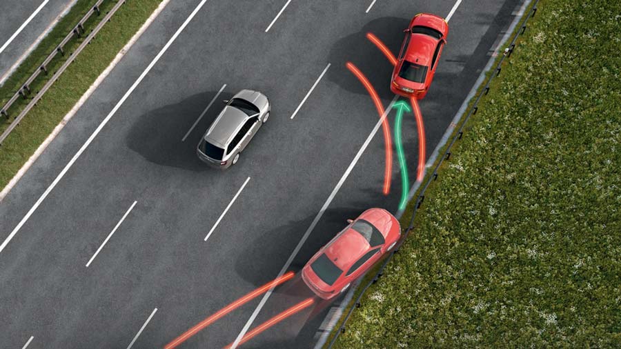 Front Assist & Hỗ trợ đánh lái tránh va chạm: Front Assist là hệ thống cảnh báo va chạm giúp giảm thiểu nguy cơ tai nạn. Khi nhận thấy va chạm khó tránh khỏi, hệ thống sẽ tự động phanh để giảm thiểu hậu quả, đồng thời có thể thực hiện phanh khẩn cấp nếu phát hiện người đi bộ hoặc người đi xe đạp cắt ngang đầu xe. Trong tình huống nguy cấp, khi Front Assist đã can thiệp bằng cách phanh và người lái cho thấy ý định đánh lái tránh né, Collision Avoidance Assist sẽ hỗ trợ điều chỉnh hướng lái có mục tiêu để giúp xe tránh vật cản an toàn hơn.